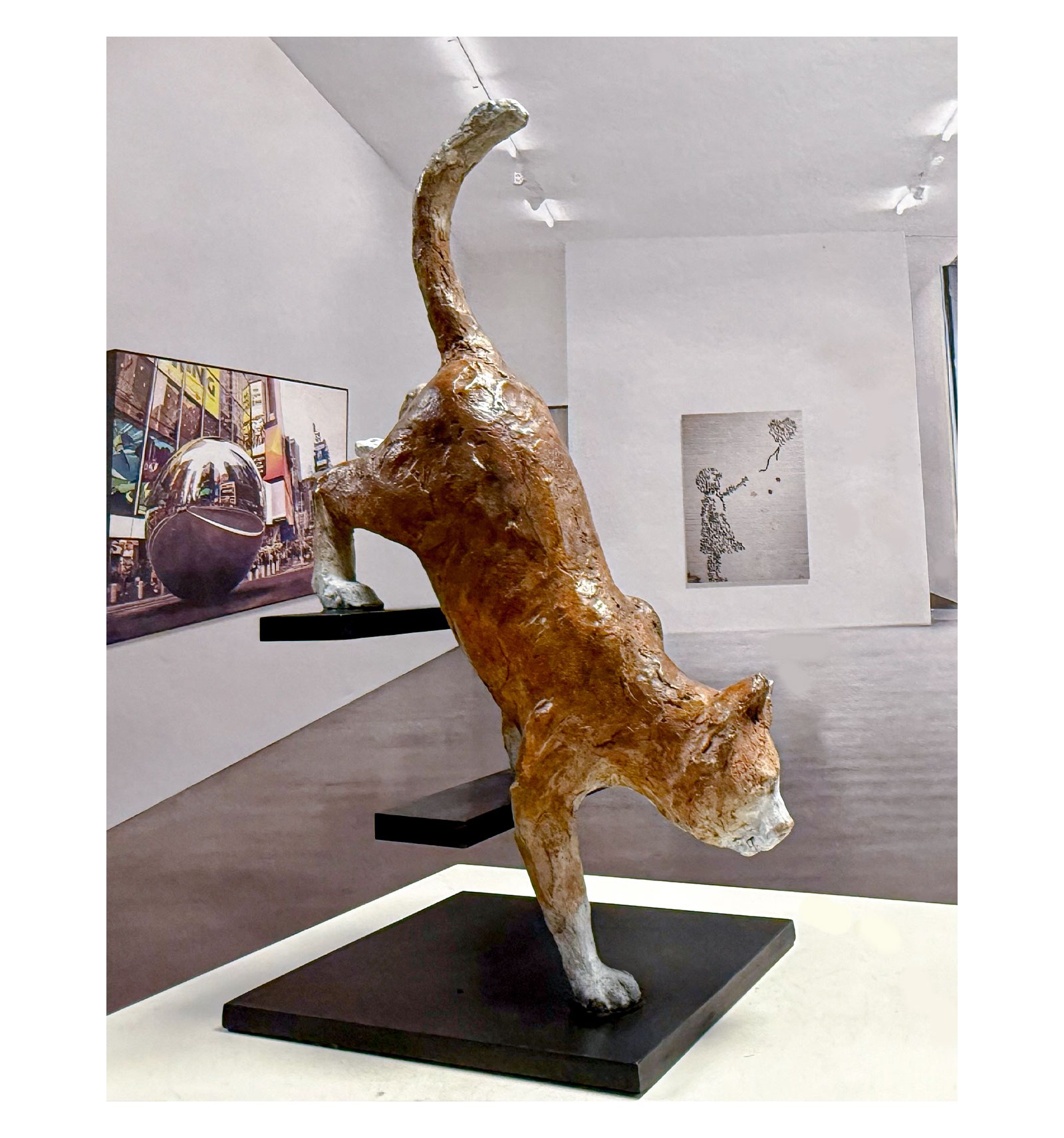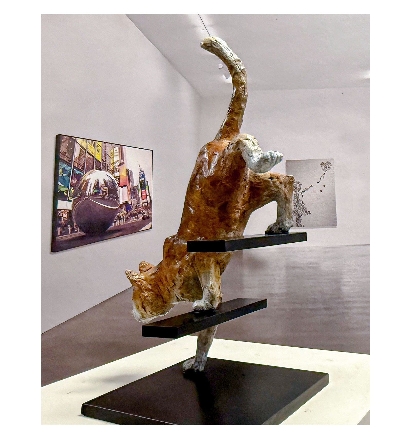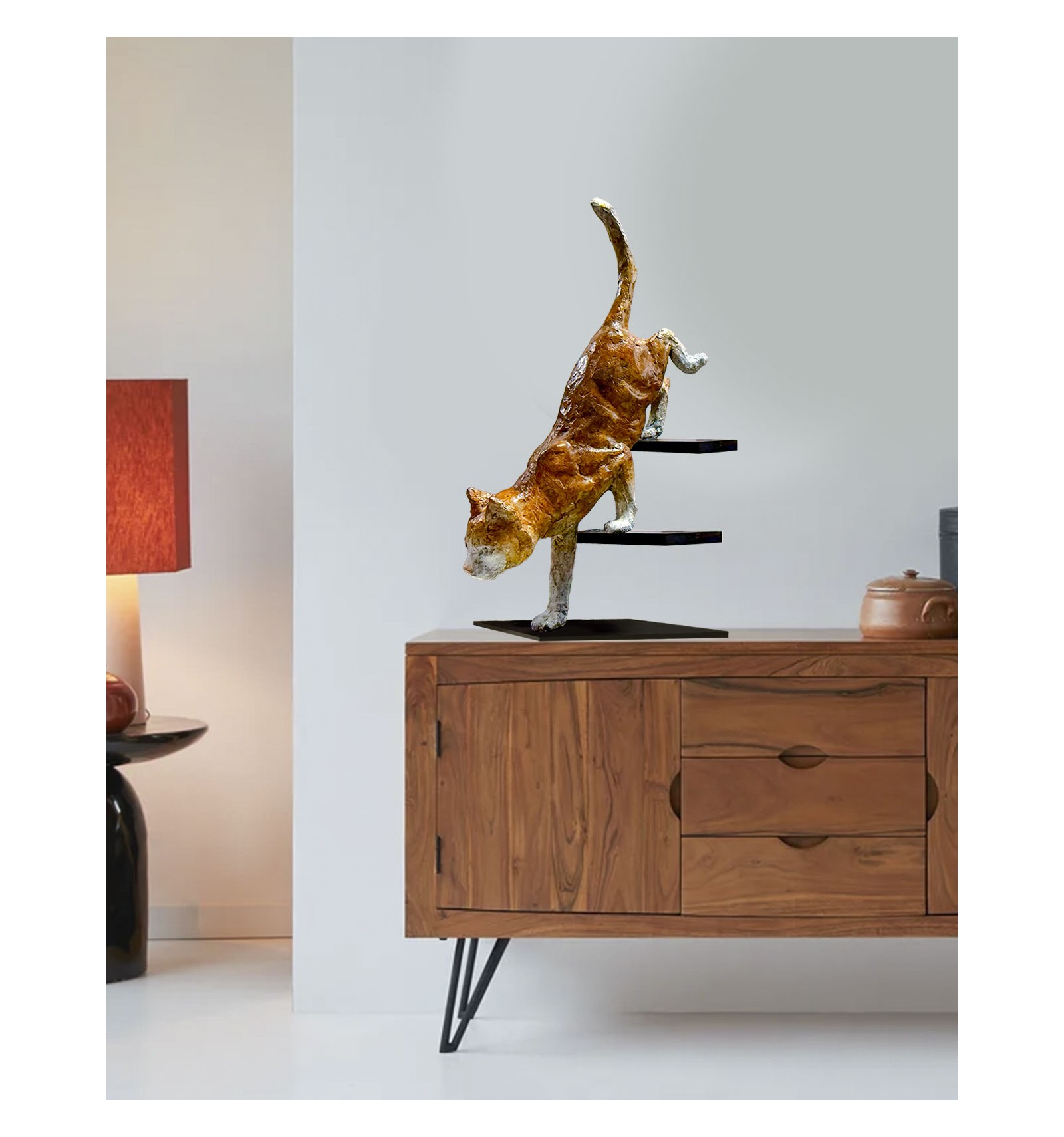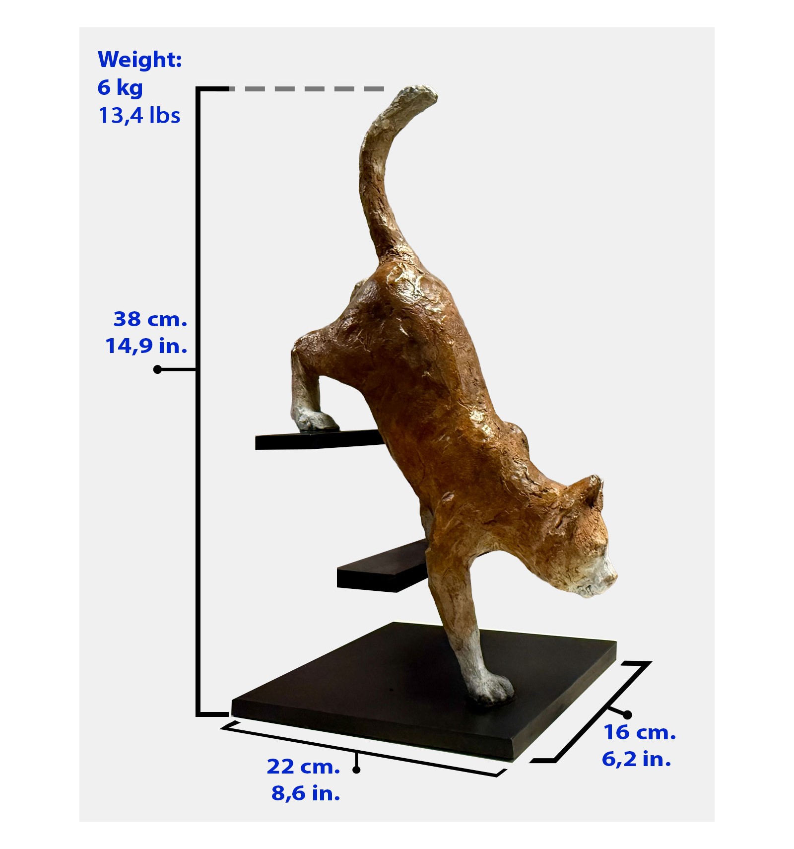 This impressionist sculpture by Miguel Guía precisely captures the hypnotic sensation we experience when watching a feline walk. A cat in full motion is suspended within a composition designed to suggest the descent of a staircase—a familiar gesture that, for a fleeting moment, becomes almost magical.