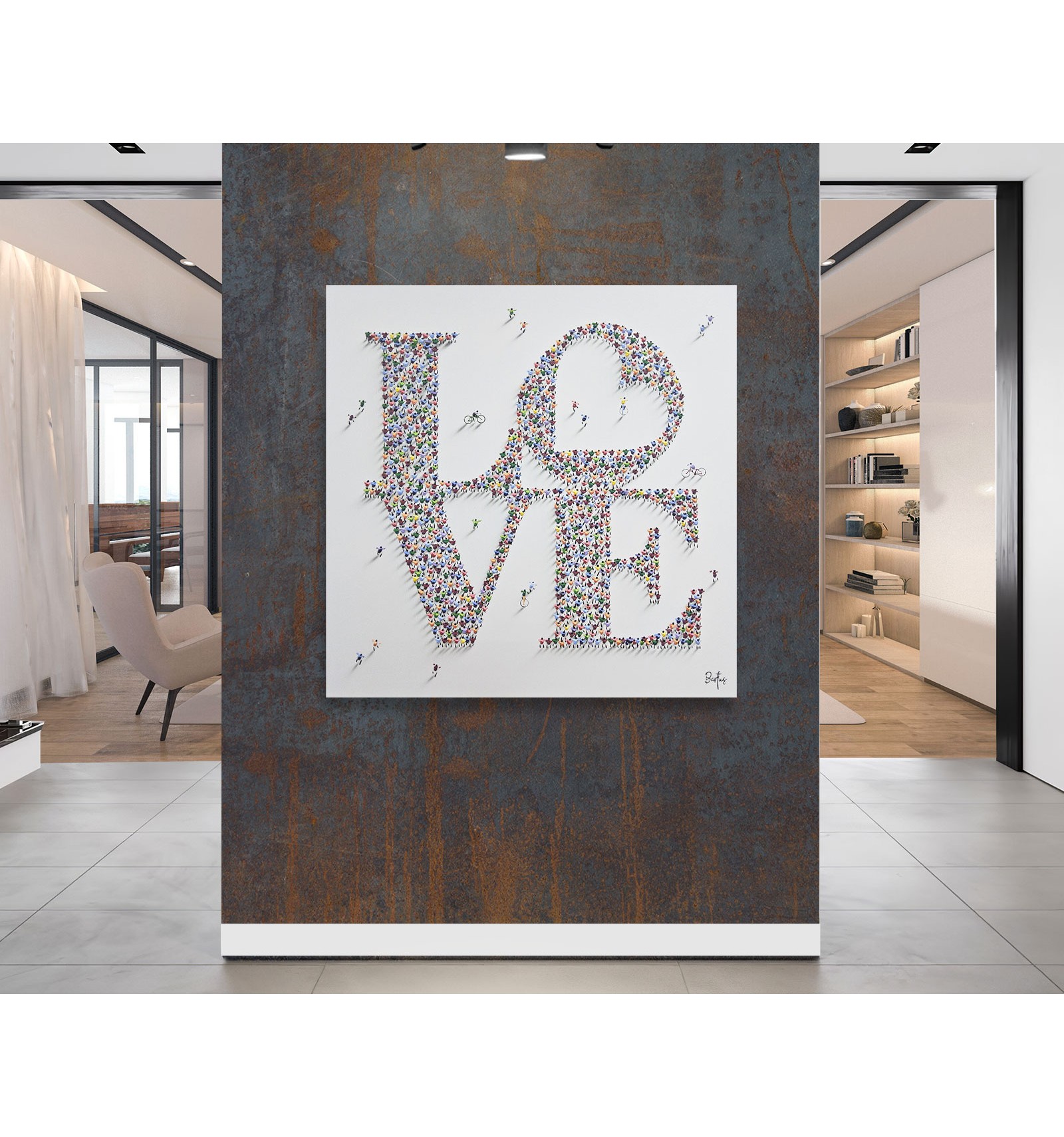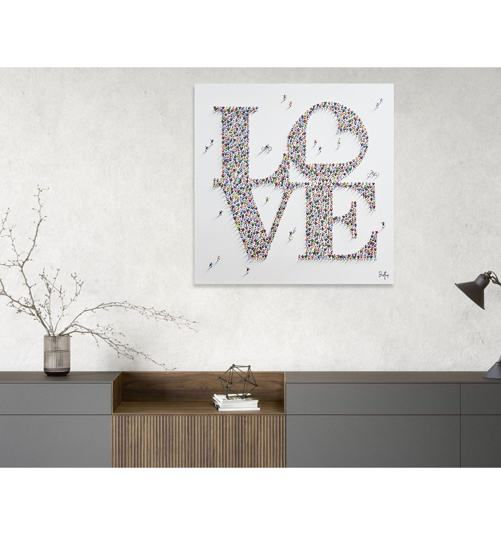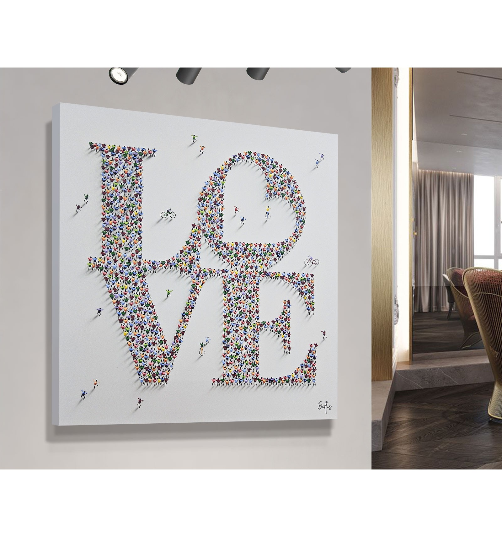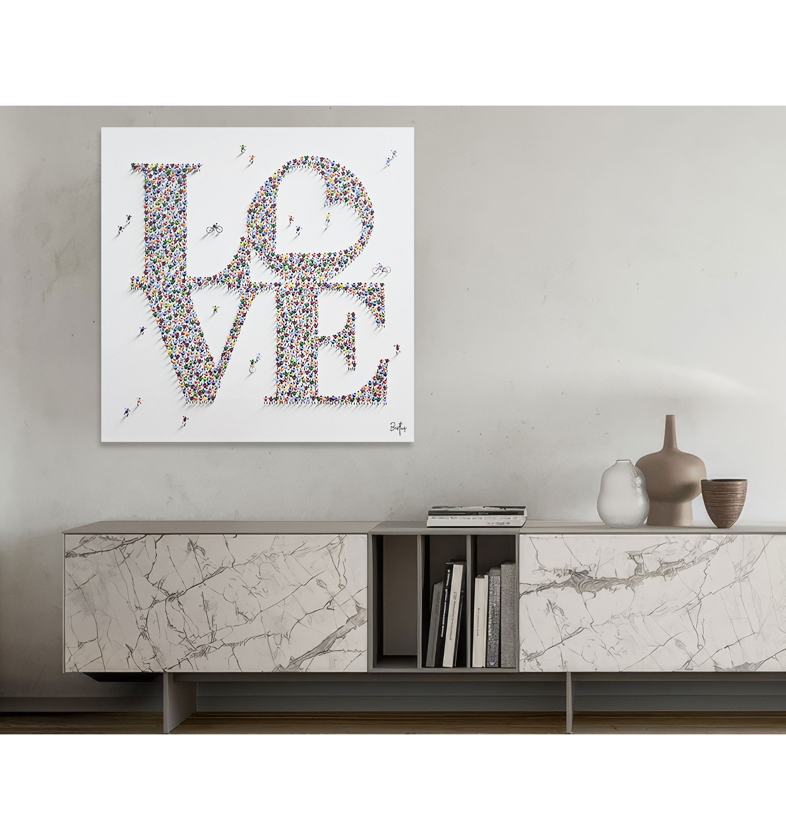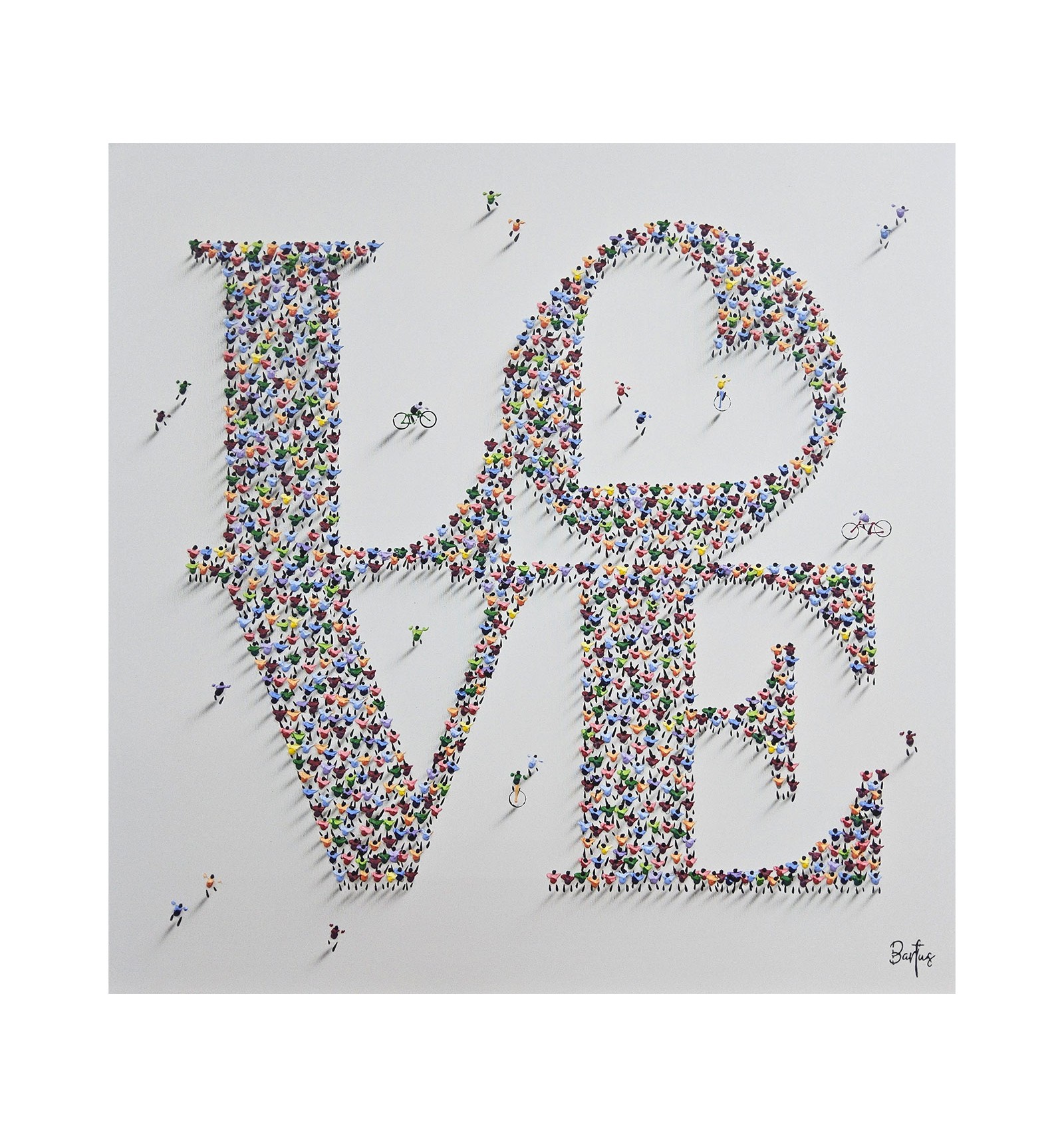 In this piece, the painter offers an optimistic and deeply human vision of the reality we share. The composition, formed by a multitude of small figures that build a common message, symbolizes how the world’s beauty does not lie in the isolated individual, but in the sum of lives, movement, and relationships that inhabit it. The artwork conveys a sense of harmony, coexistence, and hope, inviting the viewer to reflect on the value of the everyday and the collective as the foundation of a better world. Ethics and aesthetics come together once again under the gaze and brush of Francisco Bartus.