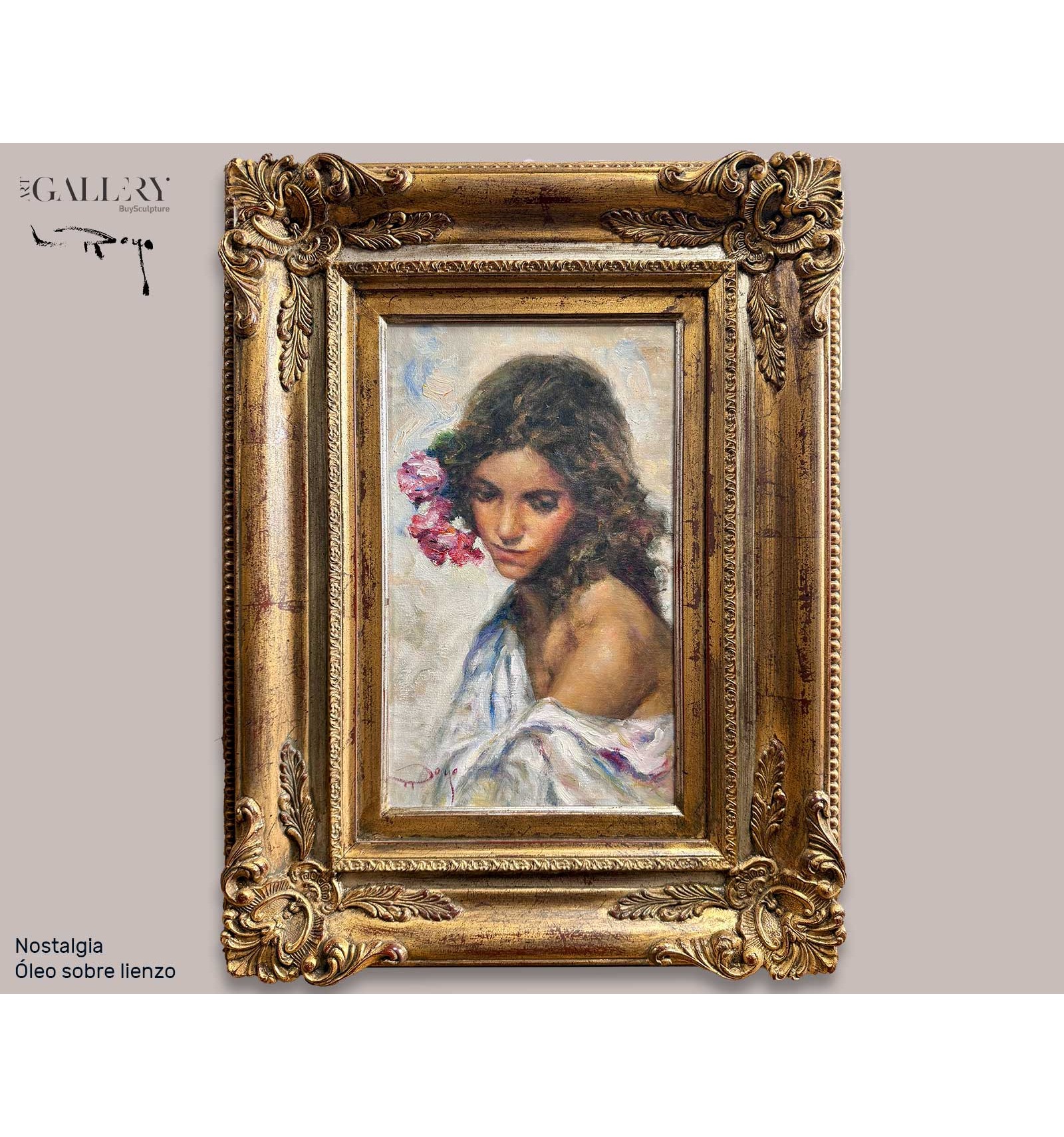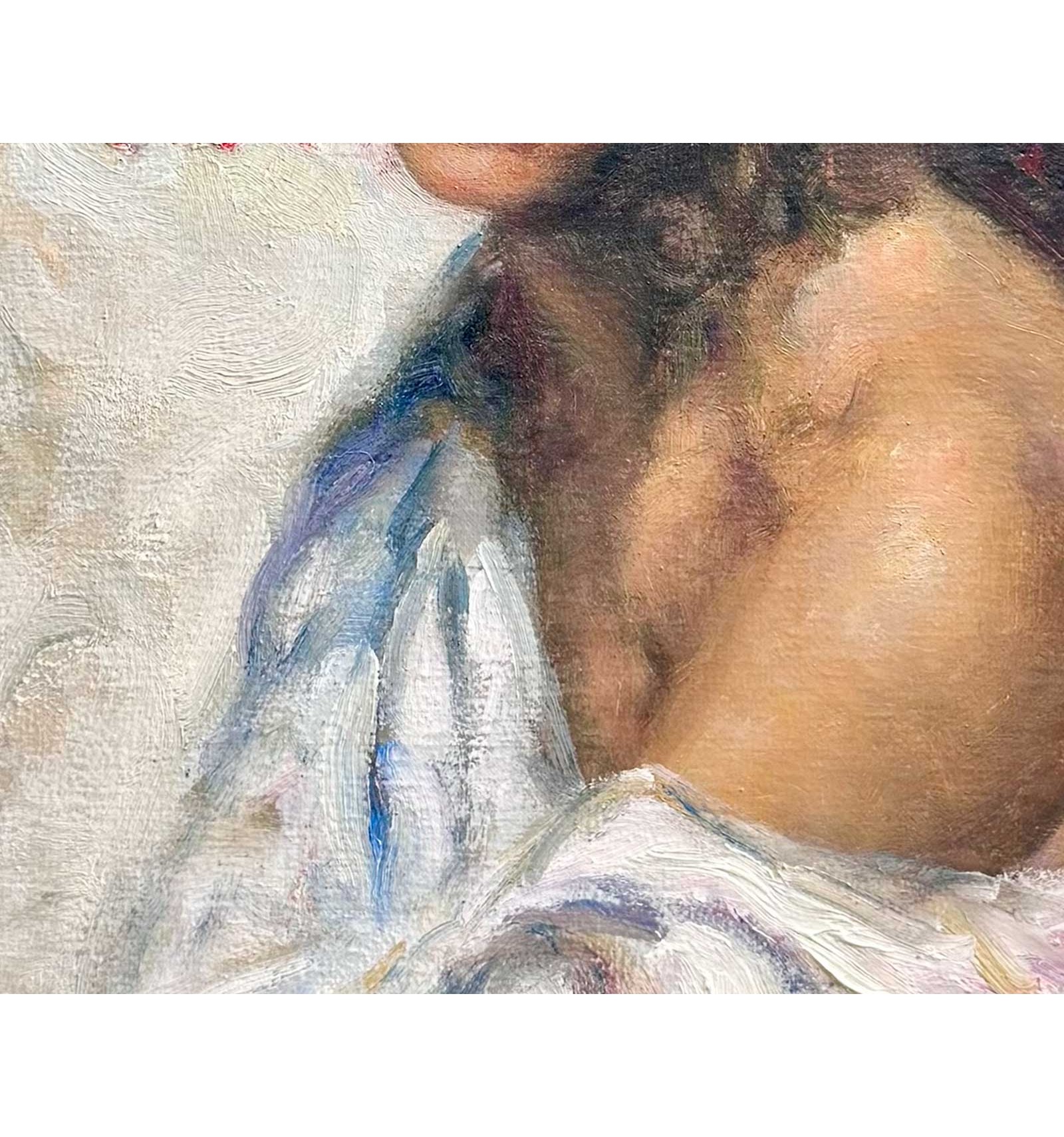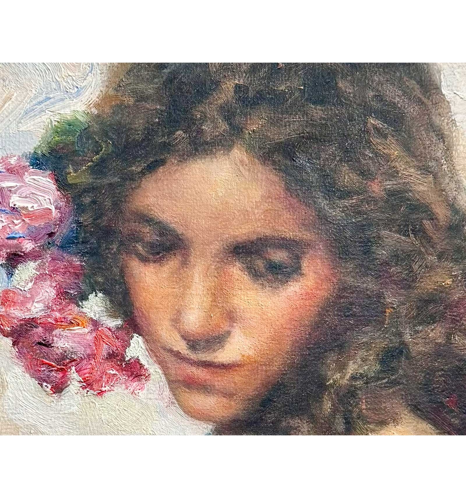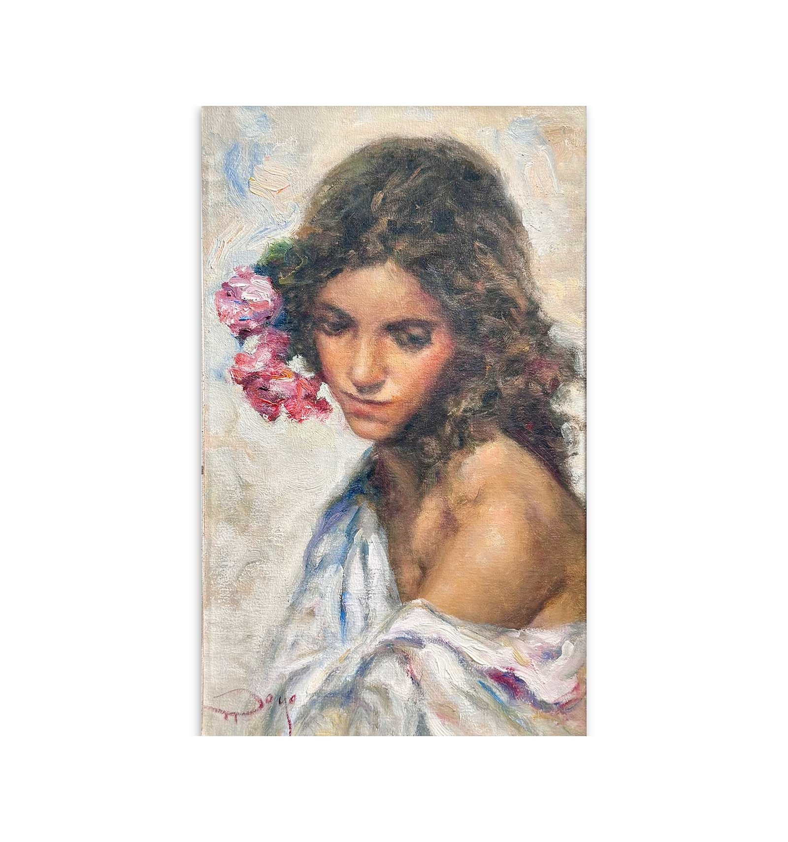 The artist masterfully combines the subtlety of his brushstroke with a rich chromatic palette, where shades of pink and gold blend with the skin and the flowers, giving the work an enveloping and profoundly human atmosphere. Each brushstroke reveals exceptional sensitivity and impeccable technique, transforming this piece into a unique, timeless creation full of soul.