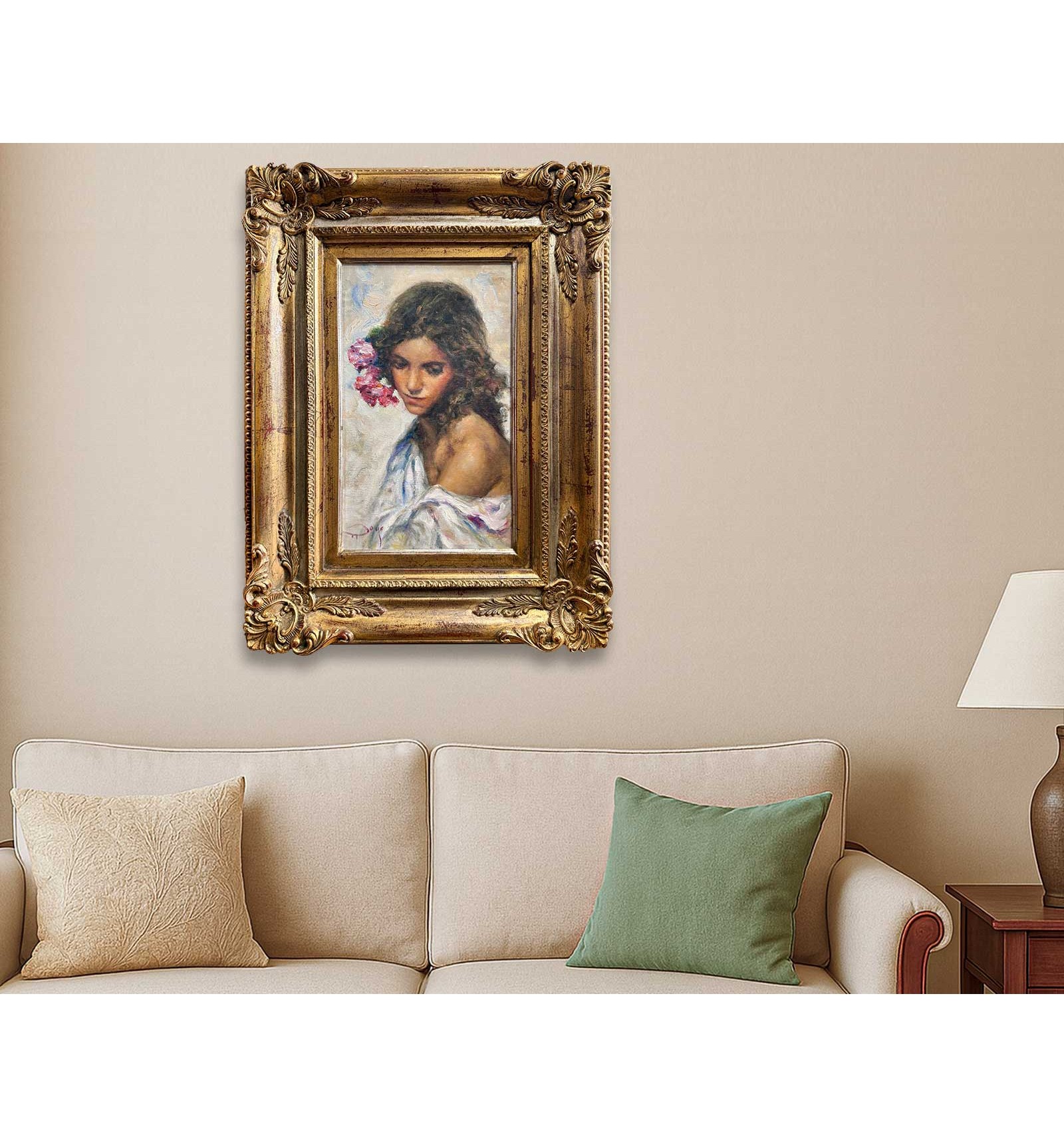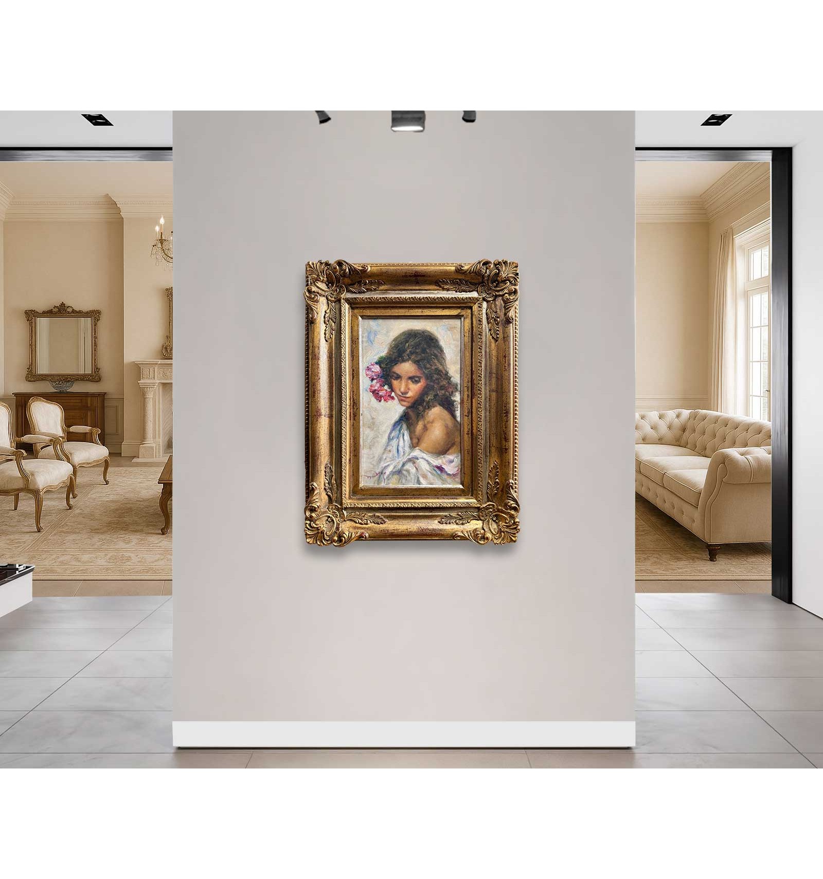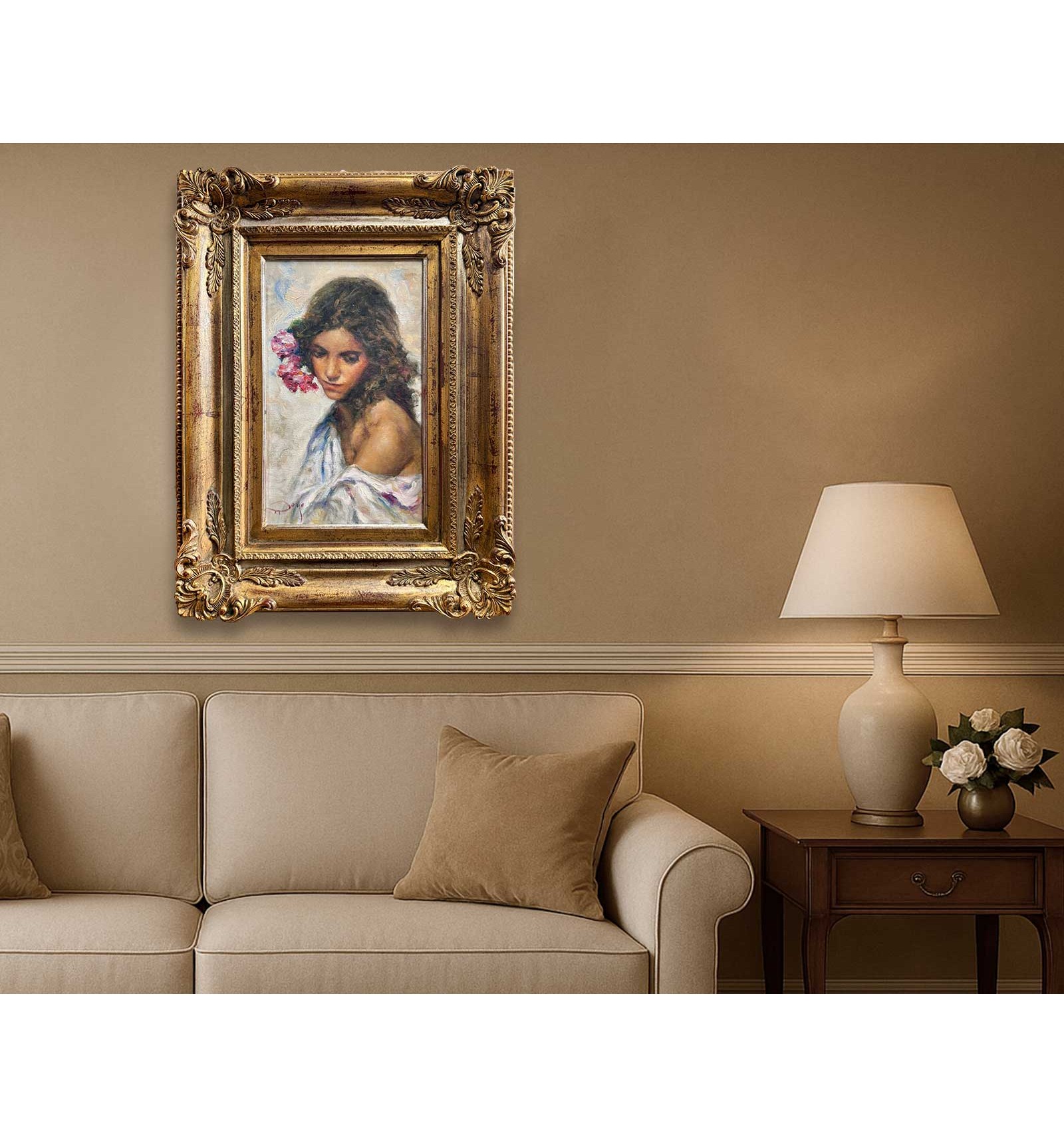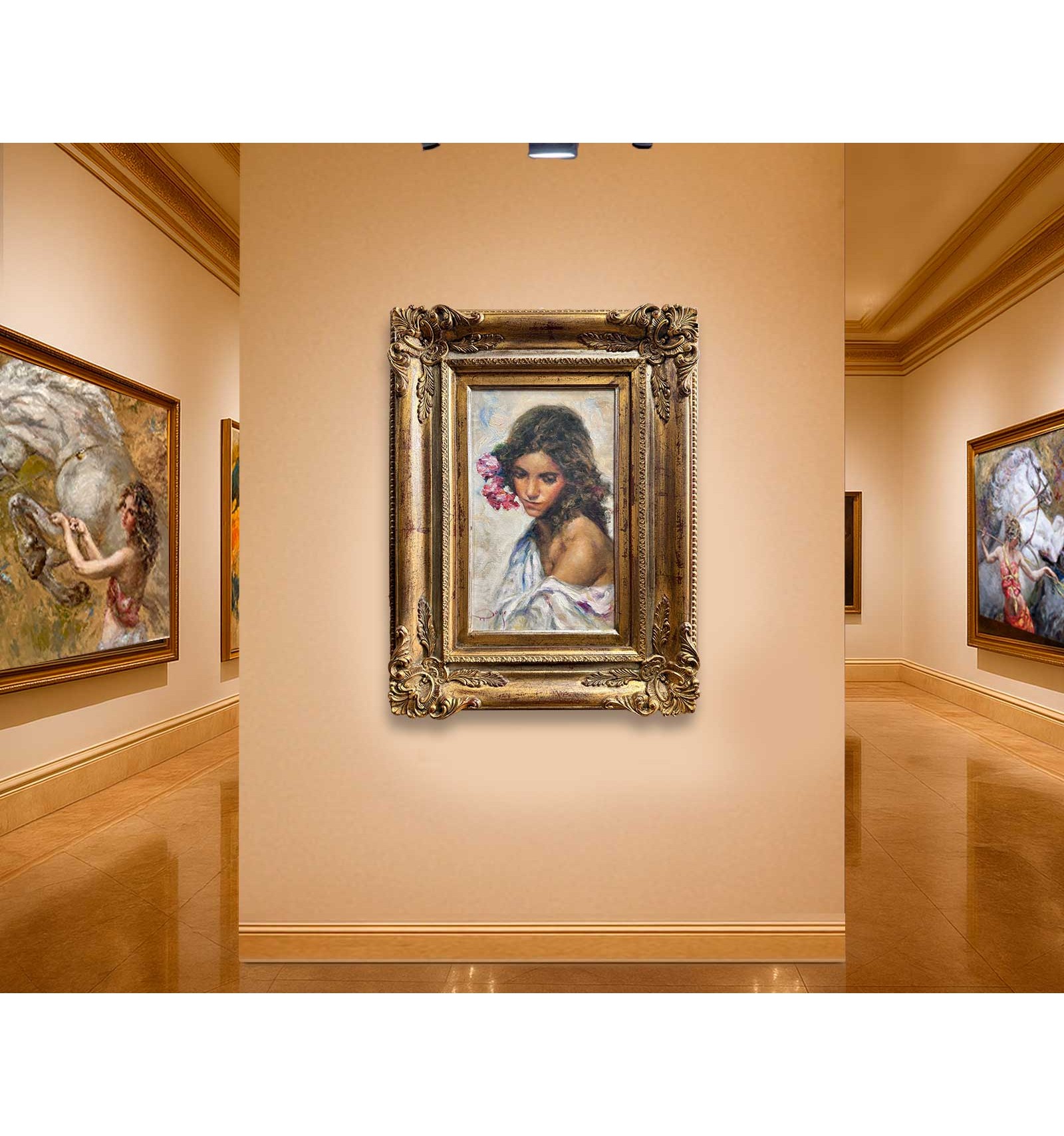The artist masterfully combines the subtlety of his brushstroke with a rich chromatic palette, where shades of pink and gold blend with the skin and the flowers, giving the work an enveloping and profoundly human atmosphere. Each brushstroke reveals exceptional sensitivity and impeccable technique, transforming this piece into a unique, timeless creation full of soul.