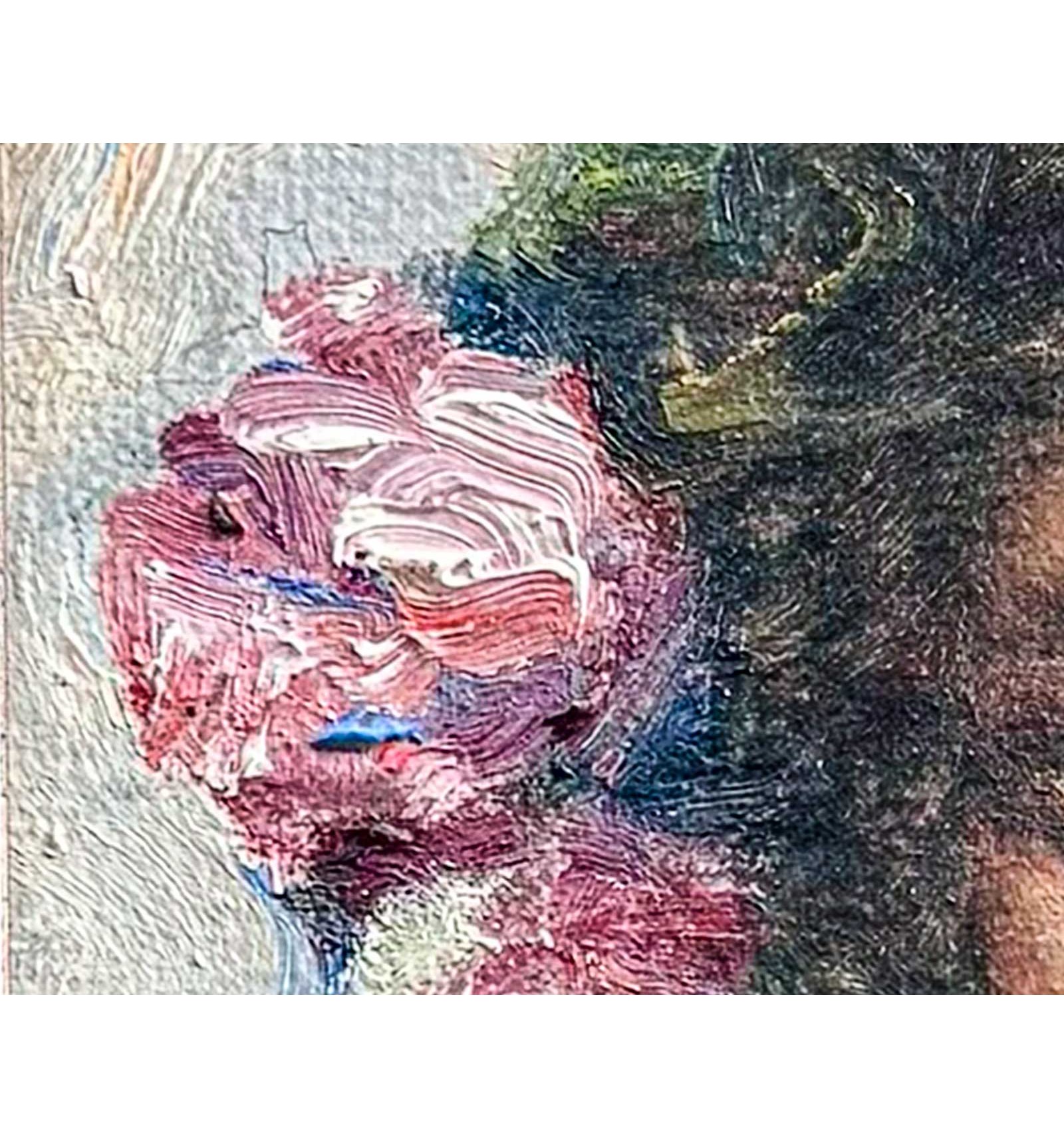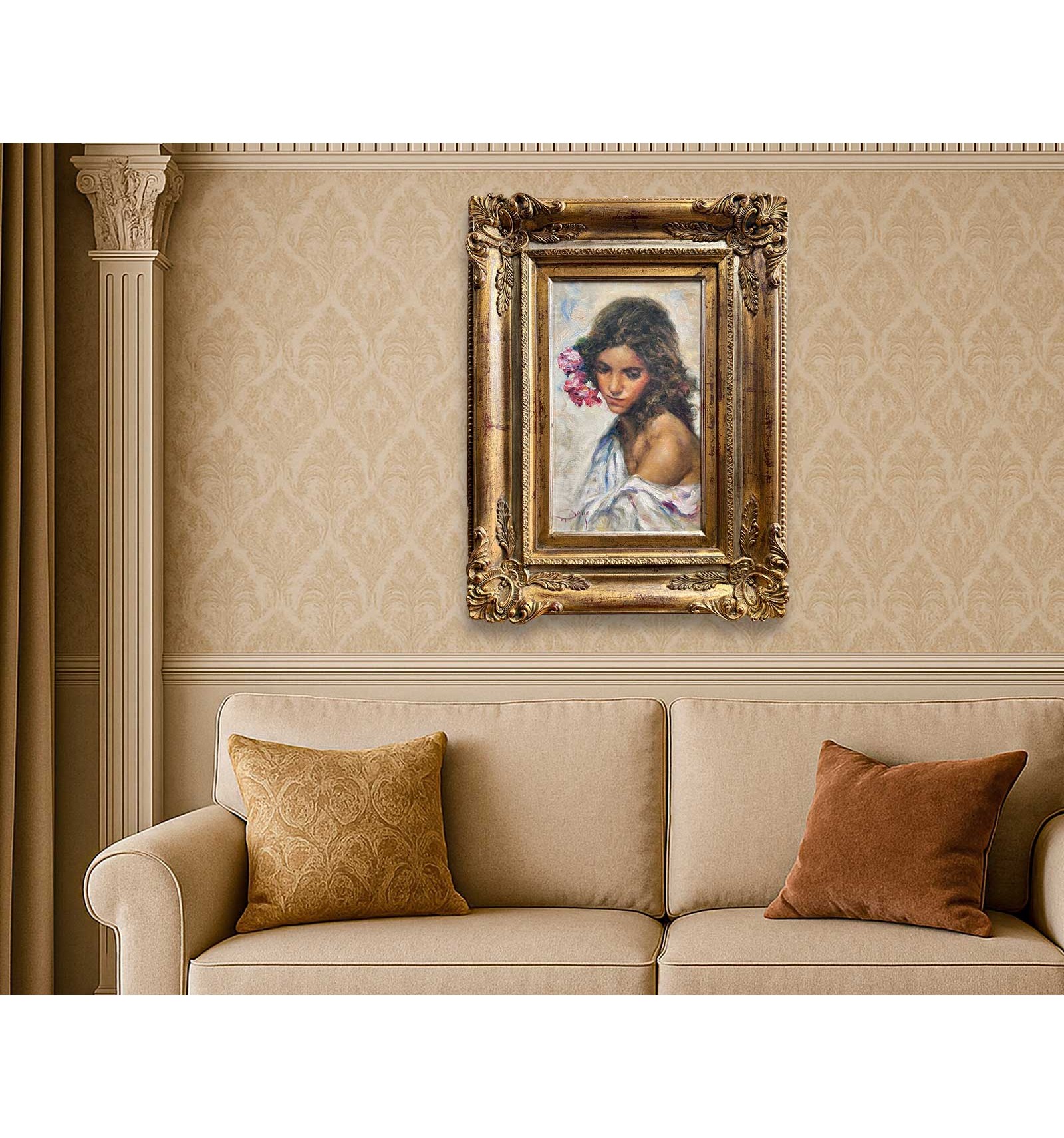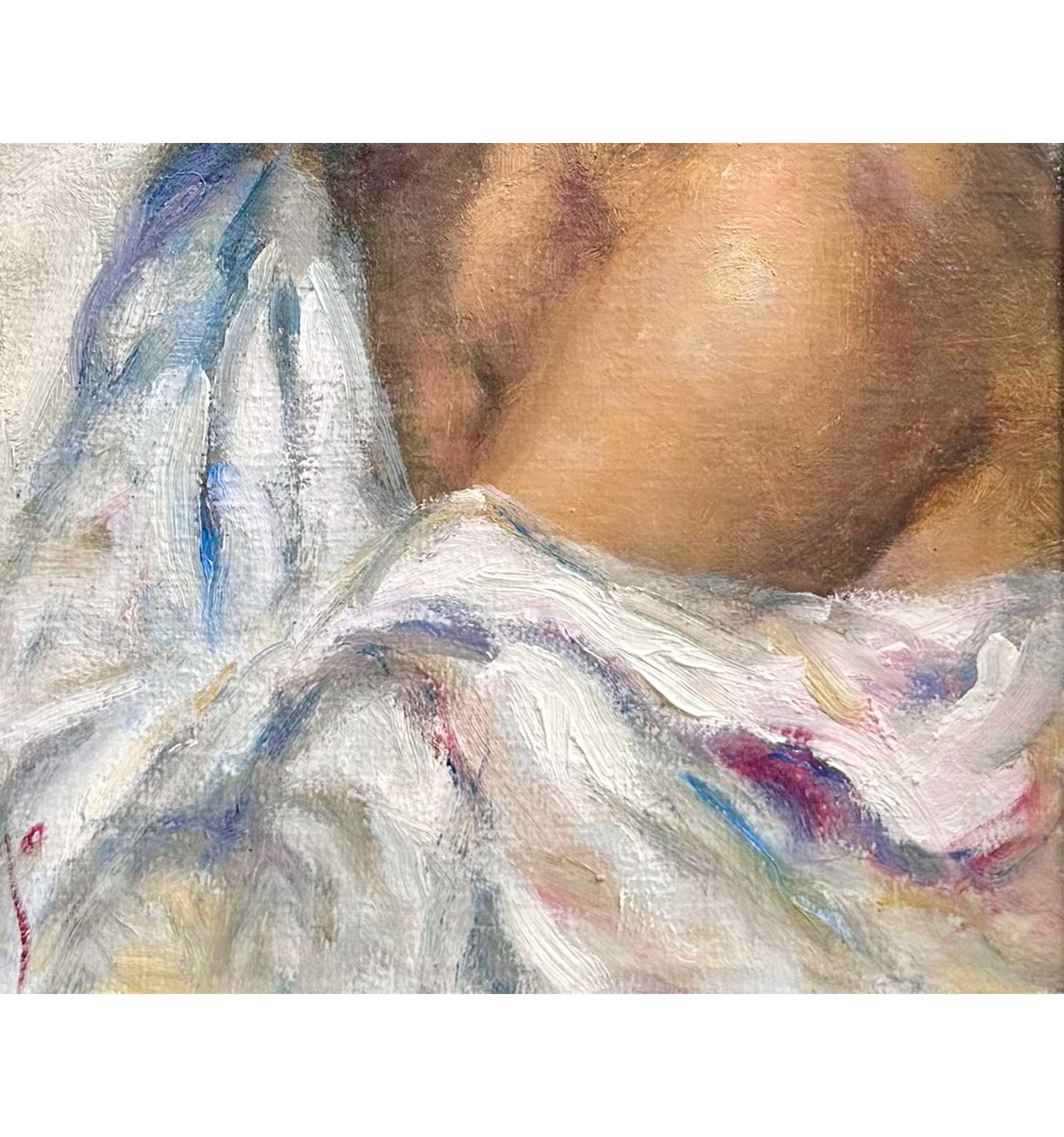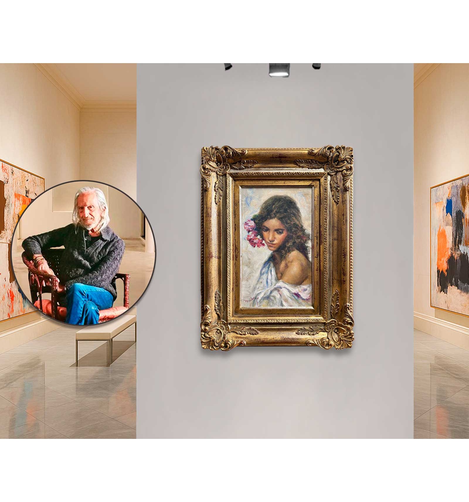 The artist masterfully combines the subtlety of his brushstroke with a rich chromatic palette, where shades of pink and gold blend with the skin and the flowers, giving the work an enveloping and profoundly human atmosphere. Each brushstroke reveals exceptional sensitivity and impeccable technique, transforming this piece into a unique, timeless creation full of soul.