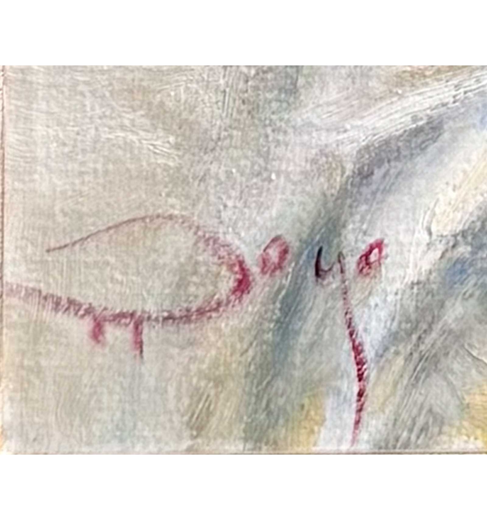 The painting is presented in a handcrafted frame, gilded and decorated by hand with water-gilded gold leaf, enhancing its unique character and making it an exceptional creation worthy of the finest collections.